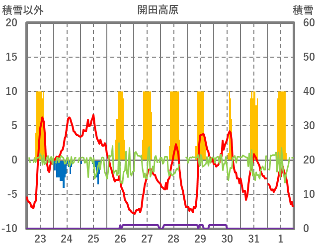 | 日 | 時 | 気温 | 降水 | 風向/風速 | 日照 | 積雪 | 降雪 |