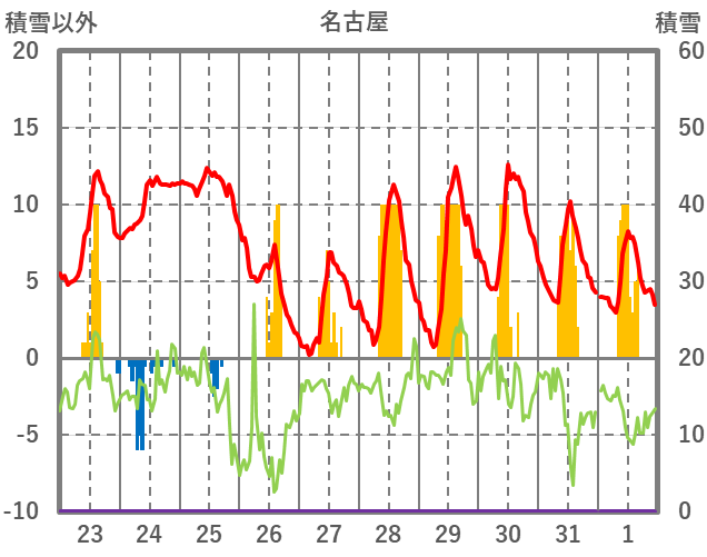 | 日 | 時 | 気温 | 降水 | 風向/風速 | 日照 | 積雪 | 降雪 |