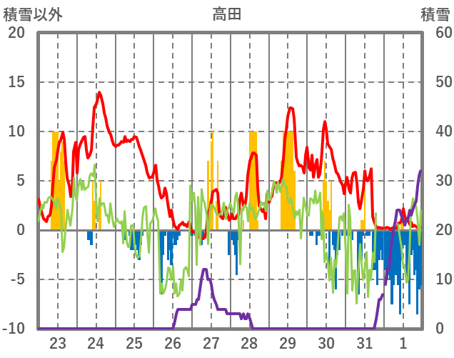 | 日 | 時 | 気温 | 降水 | 風向/風速 | 日照 | 積雪 | 降雪 |