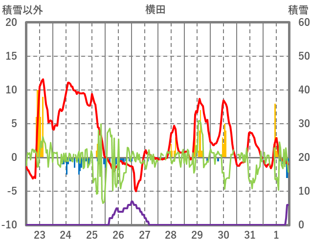 | 日 | 時 | 気温 | 降水 | 風向/風速 | 日照 | 積雪 | 降雪 |