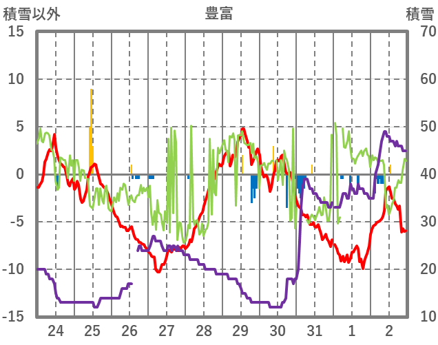 | 日 | 時 | 気温 | 降水 | 風向/風速 | 日照 | 積雪 | 降雪 |