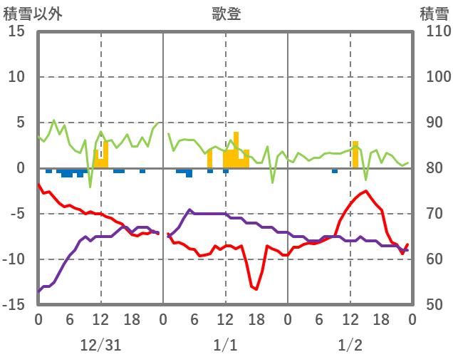 | 日 | 時 | 気温 | 降水 | 風向/風速 | 日照 | 積雪 | 降雪 |