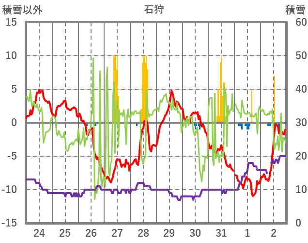 | 日 | 時 | 気温 | 降水 | 風向/風速 | 日照 | 積雪 | 降雪 |