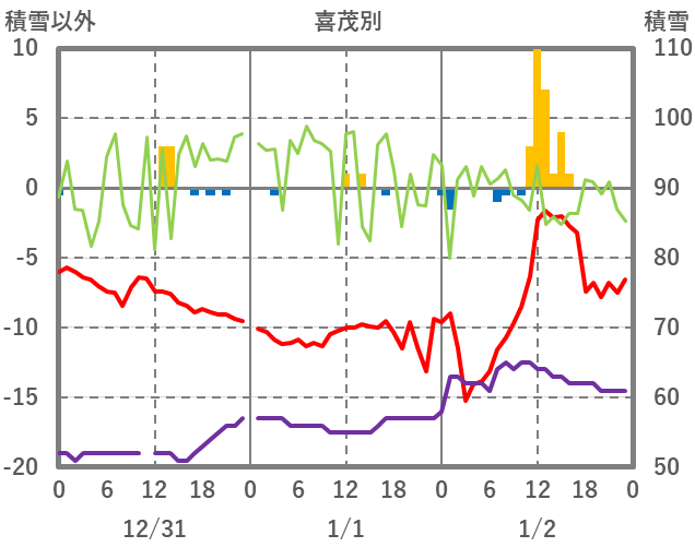 | 日 | 時 | 気温 | 降水 | 風向/風速 | 日照 | 積雪 | 降雪 |