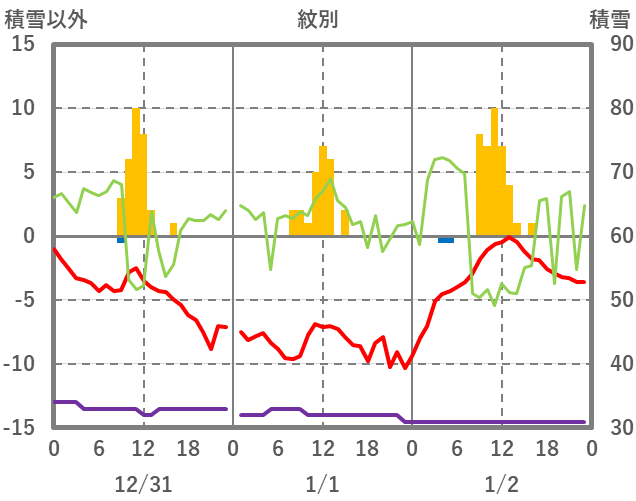 | 日 | 時 | 気温 | 降水 | 風向/風速 | 日照 | 積雪 | 降雪 |