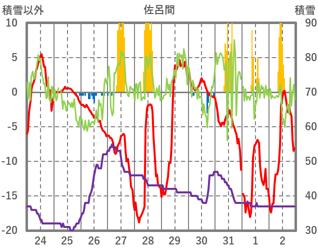 | 日 | 時 | 気温 | 降水 | 風向/風速 | 日照 | 積雪 | 降雪 |
