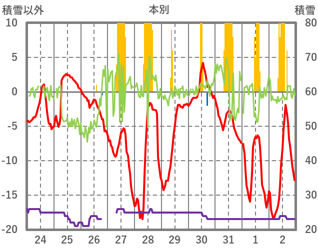 | 日 | 時 | 気温 | 降水 | 風向/風速 | 日照 | 積雪 | 降雪 |