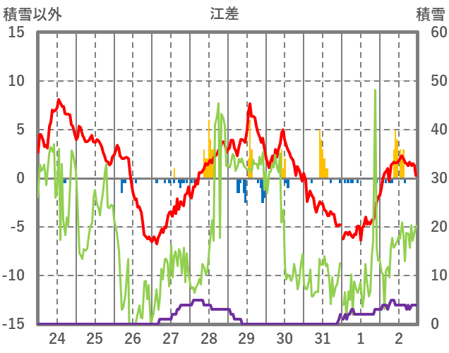 | 日 | 時 | 気温 | 降水 | 風向/風速 | 日照 | 積雪 | 降雪 |
