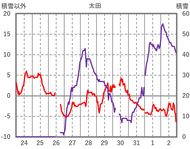 | 日 | 時 | 気温 | 降水 | 風向/風速 | 日照 | 積雪 | 降雪 |