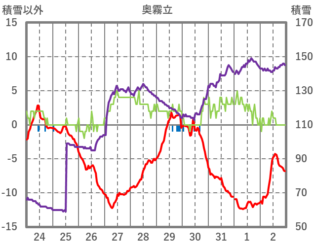 | 日 | 時 | 気温 | 降水 | 風向/風速 | 日照 | 積雪 | 降雪 |