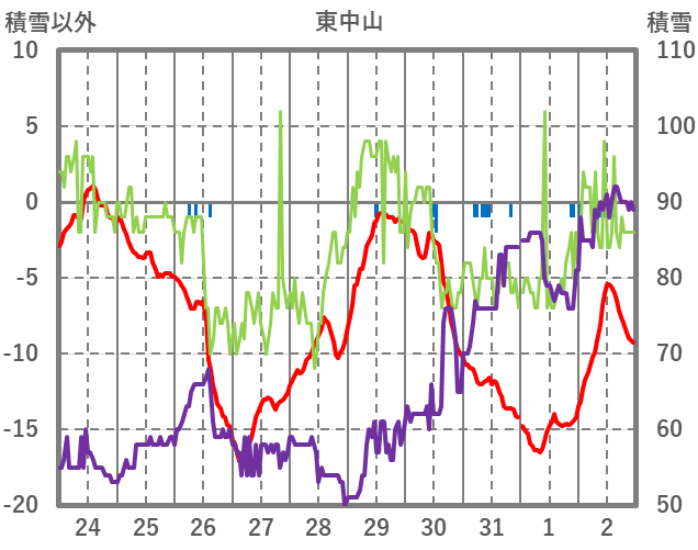 | 日 | 時 | 気温 | 降水 | 風向/風速 | 日照 | 積雪 | 降雪 |