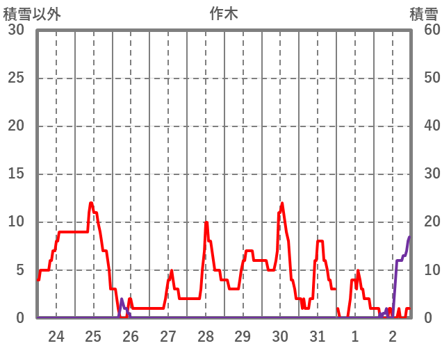 | 日 | 時 | 気温 | 降水 | 風向/風速 | 日照 | 積雪 | 降雪 |