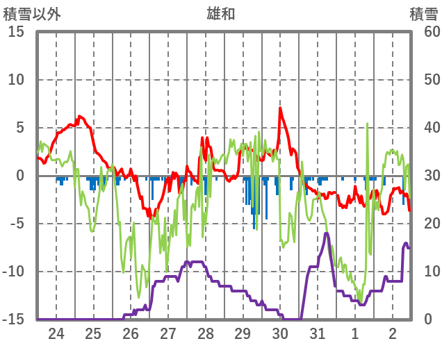| 日 | 時 | 気温 | 降水 | 風向/風速 | 日照 | 積雪 | 降雪 |