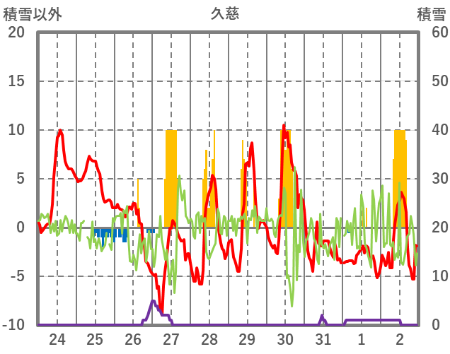 | 日 | 時 | 気温 | 降水 | 風向/風速 | 日照 | 積雪 | 降雪 |