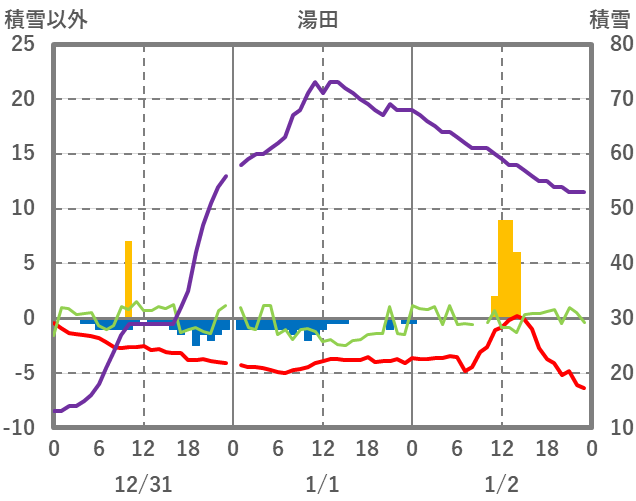 | 日 | 時 | 気温 | 降水 | 風向/風速 | 日照 | 積雪 | 降雪 |