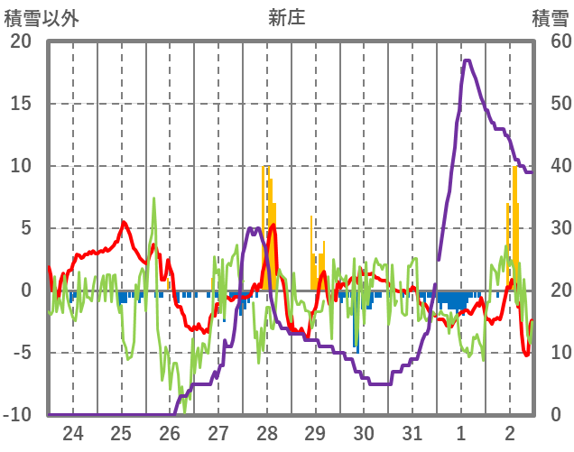 | 日 | 時 | 気温 | 降水 | 風向/風速 | 日照 | 積雪 | 降雪 |