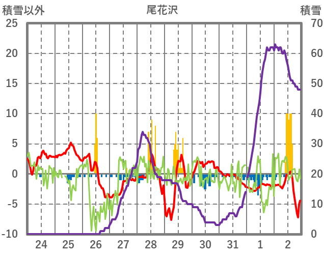 | 日 | 時 | 気温 | 降水 | 風向/風速 | 日照 | 積雪 | 降雪 |