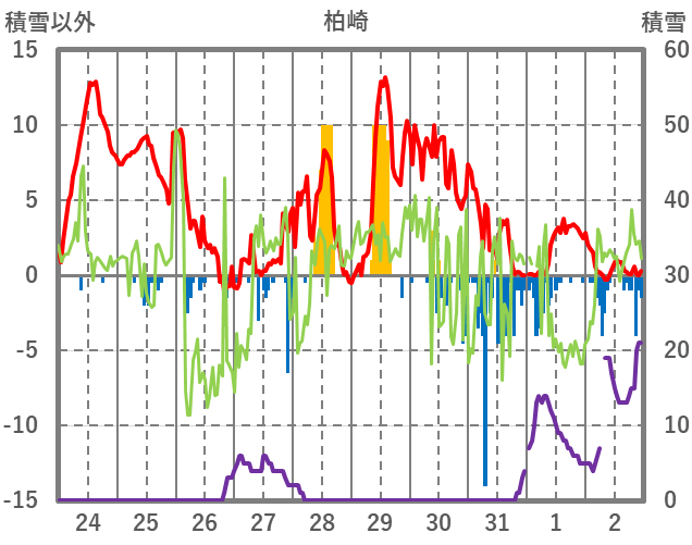 | 日 | 時 | 気温 | 降水 | 風向/風速 | 日照 | 積雪 | 降雪 |