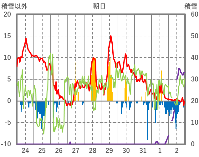 | 日 | 時 | 気温 | 降水 | 風向/風速 | 日照 | 積雪 | 降雪 |