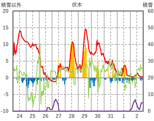 | 日 | 時 | 気温 | 降水 | 風向/風速 | 日照 | 積雪 | 降雪 |