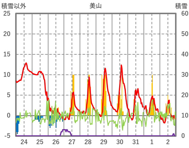 | 日 | 時 | 気温 | 降水 | 風向/風速 | 日照 | 積雪 | 降雪 |