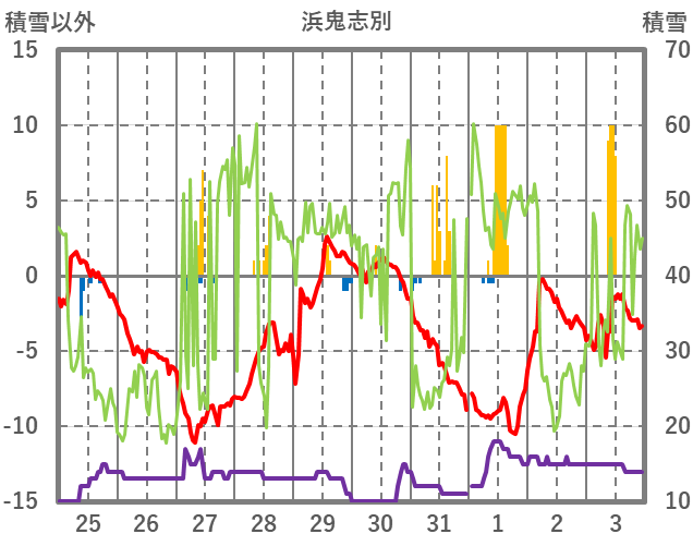| 日 | 時 | 気温 | 降水 | 風向/風速 | 日照 | 積雪 | 降雪 |