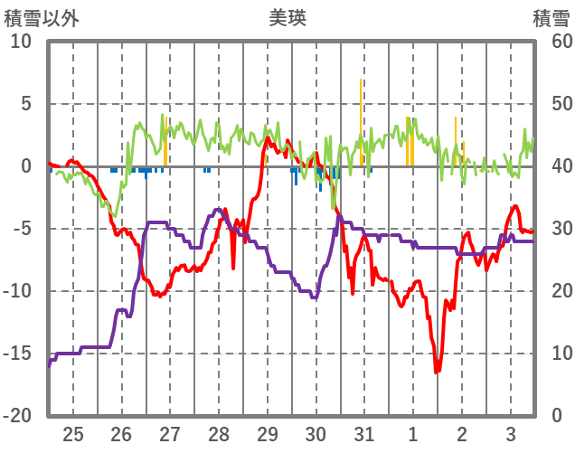 | 日 | 時 | 気温 | 降水 | 風向/風速 | 日照 | 積雪 | 降雪 |