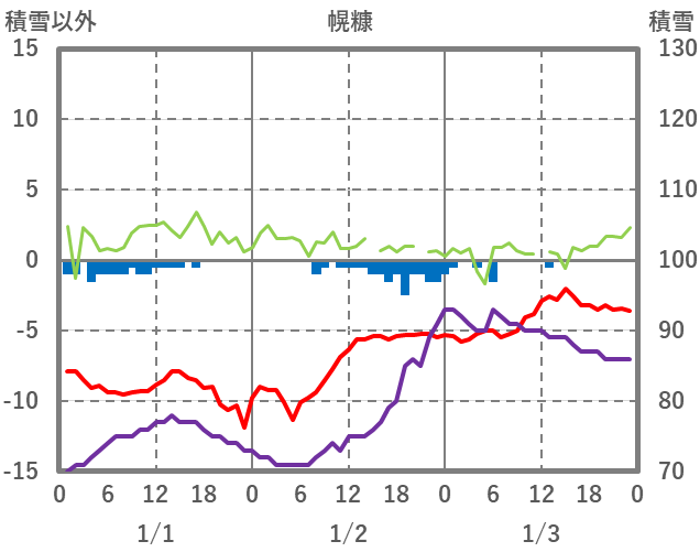 | 日 | 時 | 気温 | 降水 | 風向/風速 | 日照 | 積雪 | 降雪 |