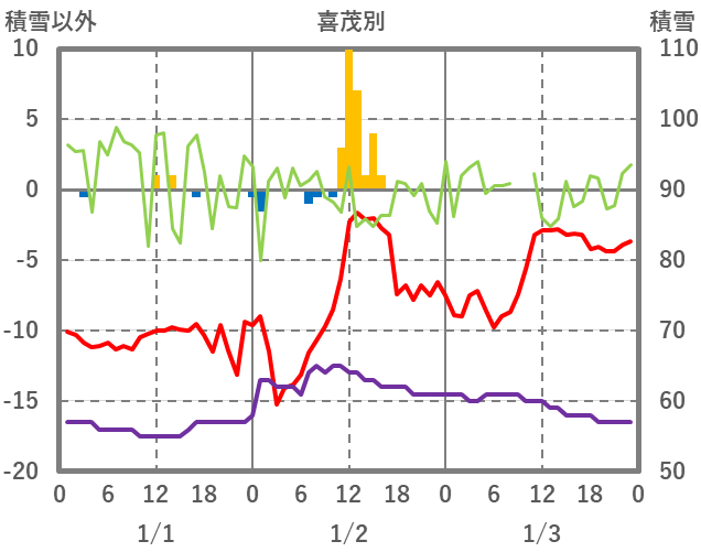 | 日 | 時 | 気温 | 降水 | 風向/風速 | 日照 | 積雪 | 降雪 |