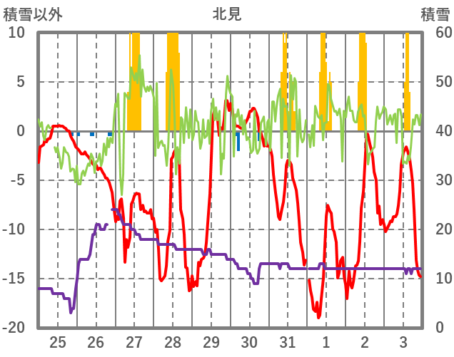 | 日 | 時 | 気温 | 降水 | 風向/風速 | 日照 | 積雪 | 降雪 |
