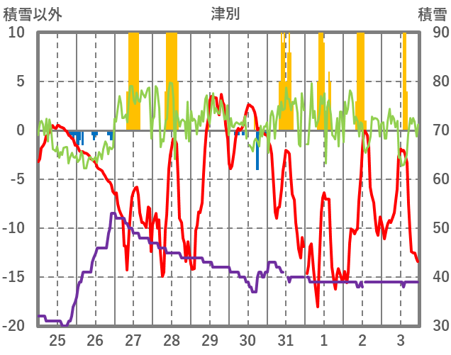 | 日 | 時 | 気温 | 降水 | 風向/風速 | 日照 | 積雪 | 降雪 |