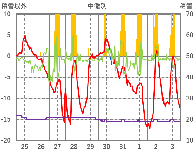| 日 | 時 | 気温 | 降水 | 風向/風速 | 日照 | 積雪 | 降雪 |