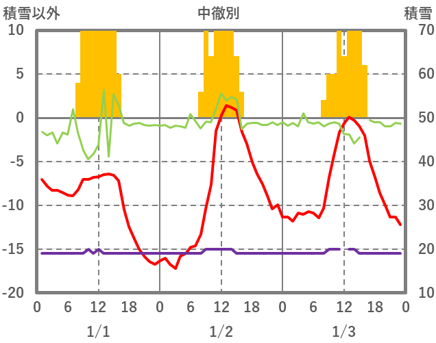 | 日 | 時 | 気温 | 降水 | 風向/風速 | 日照 | 積雪 | 降雪 |