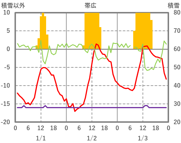 | 日 | 時 | 気温 | 降水 | 風向/風速 | 日照 | 積雪 | 降雪 |
