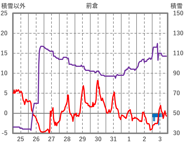 | 日 | 時 | 気温 | 降水 | 風向/風速 | 日照 | 積雪 | 降雪 |