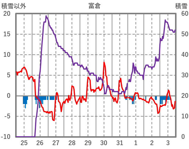 | 日 | 時 | 気温 | 降水 | 風向/風速 | 日照 | 積雪 | 降雪 |