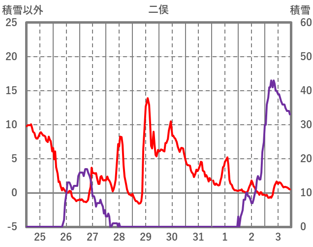 | 日 | 時 | 気温 | 降水 | 風向/風速 | 日照 | 積雪 | 降雪 |