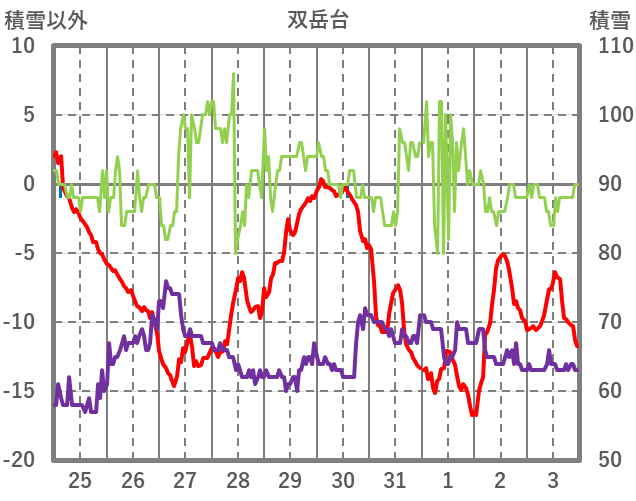 | 日 | 時 | 気温 | 降水 | 風向/風速 | 日照 | 積雪 | 降雪 |