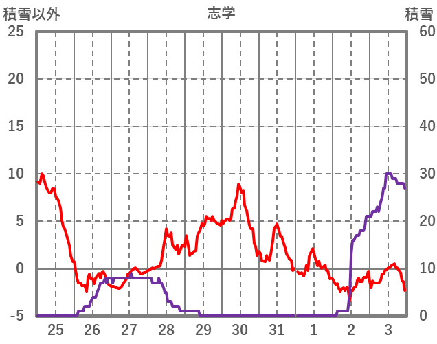 | 日 | 時 | 気温 | 降水 | 風向/風速 | 日照 | 積雪 | 降雪 |