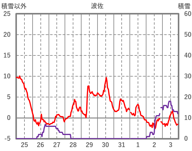 | 日 | 時 | 気温 | 降水 | 風向/風速 | 日照 | 積雪 | 降雪 |