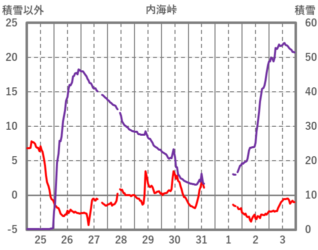 | 日 | 時 | 気温 | 降水 | 風向/風速 | 日照 | 積雪 | 降雪 |