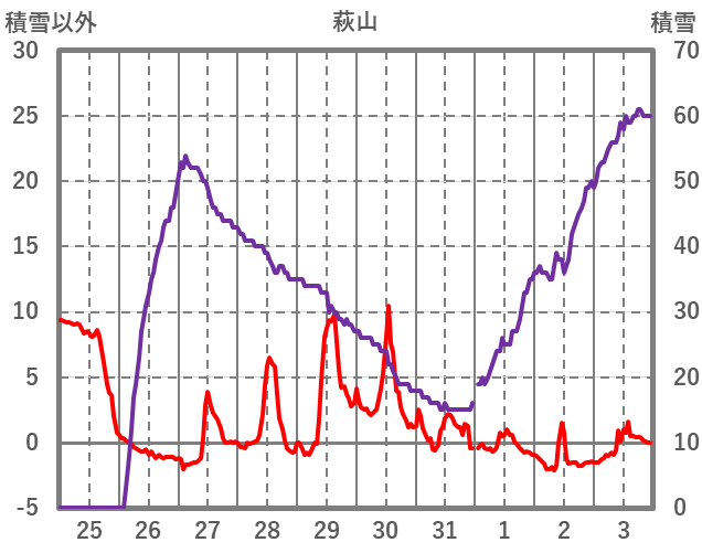 | 日 | 時 | 気温 | 降水 | 風向/風速 | 日照 | 積雪 | 降雪 |