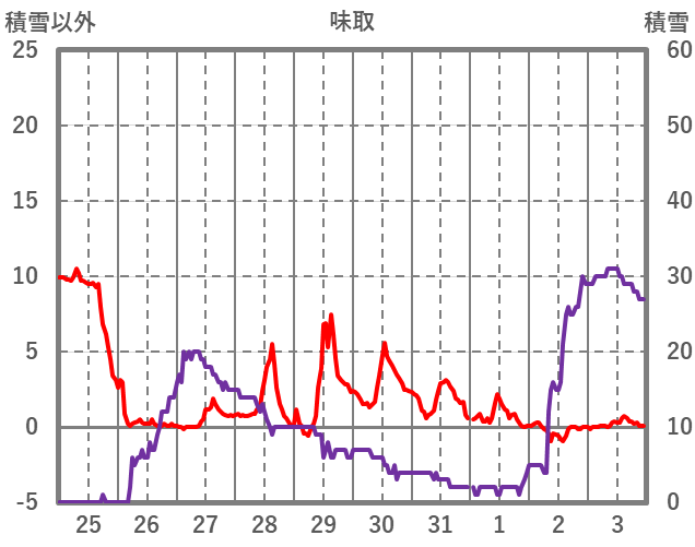 | 日 | 時 | 気温 | 降水 | 風向/風速 | 日照 | 積雪 | 降雪 |