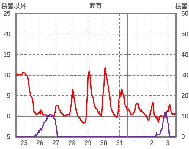 | 日 | 時 | 気温 | 降水 | 風向/風速 | 日照 | 積雪 | 降雪 |