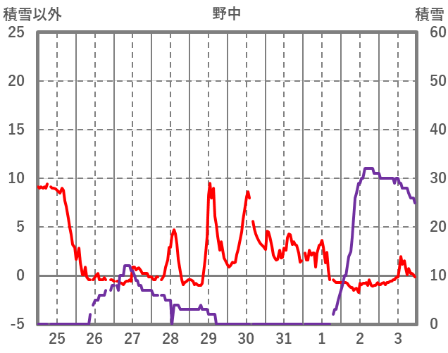 | 日 | 時 | 気温 | 降水 | 風向/風速 | 日照 | 積雪 | 降雪 |