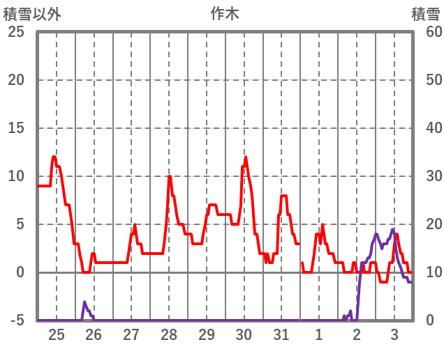 | 日 | 時 | 気温 | 降水 | 風向/風速 | 日照 | 積雪 | 降雪 |