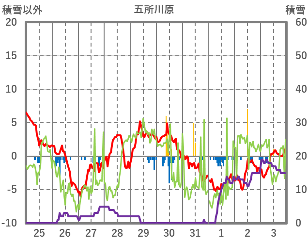 | 日 | 時 | 気温 | 降水 | 風向/風速 | 日照 | 積雪 | 降雪 |