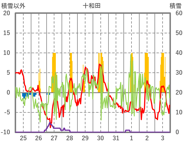 | 日 | 時 | 気温 | 降水 | 風向/風速 | 日照 | 積雪 | 降雪 |