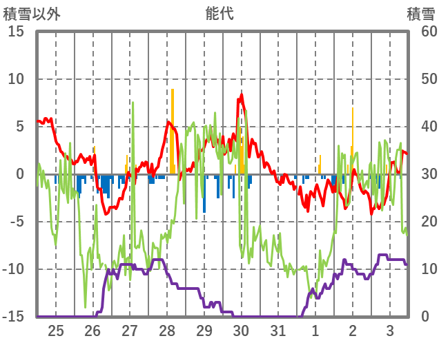 | 日 | 時 | 気温 | 降水 | 風向/風速 | 日照 | 積雪 | 降雪 |
