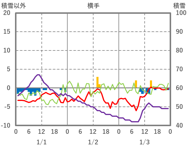| 日 | 時 | 気温 | 降水 | 風向/風速 | 日照 | 積雪 | 降雪 |